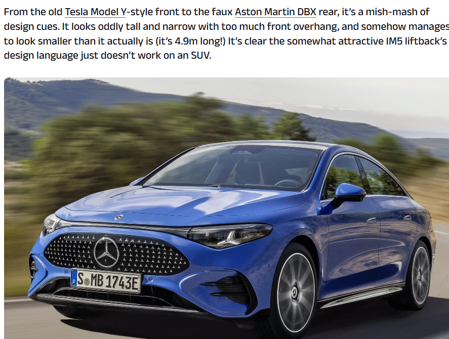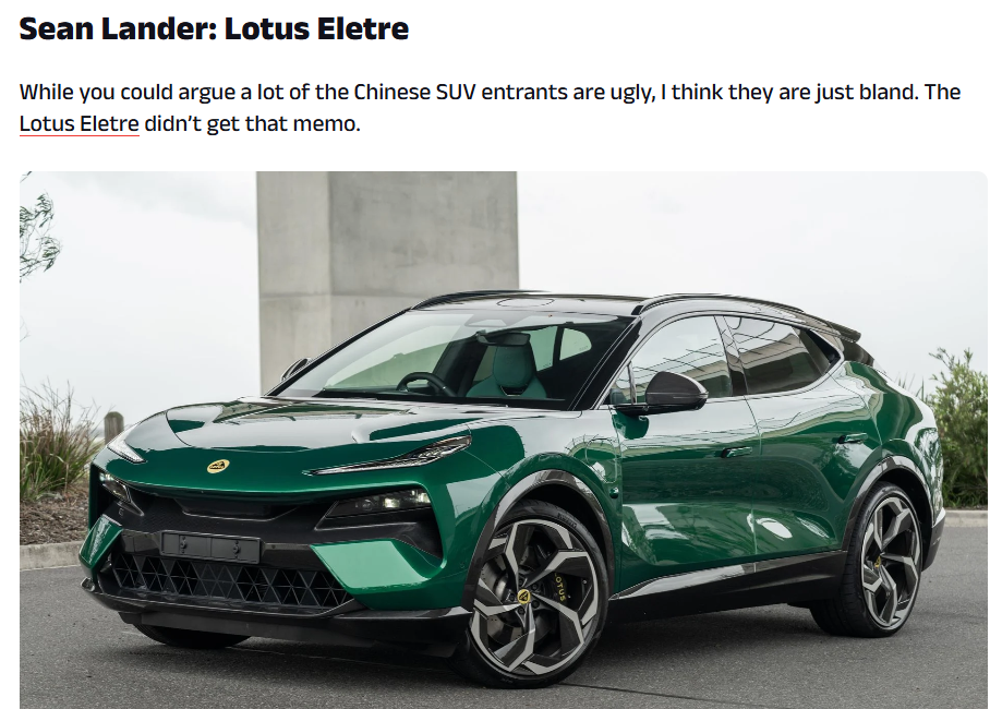 榜单上位列榜首的是现代Ioniq 6。评审人员批评其后部下垂过度,整体轮廓被形容为“汽车界的苹果鼠标”,甚至类似于1998年被冷落的AU Falcon车型。紧随其后的是中国品牌智己的IM6(国内对应车型为LS6)。批评指出这款车试图融合多种设计语言:前脸模仿老款特斯拉Model Y(参数丨图片),尾部则借鉴阿斯顿·马丁DBX的元素。结果导致整体风格割裂,车身看起来高而窄,前部突出太多,视觉上反而比实际尺寸更小。另一款上榜的中国车型莲花Emira则被评价为前脸设计缺乏原创性,仿佛“通过一条零散的电话线向设计师描述一辆法拉利Purosangue”。车尾部分则被指显得暗淡无光,仿佛设计师忘记了完成尾翼和内饰的细节打磨。