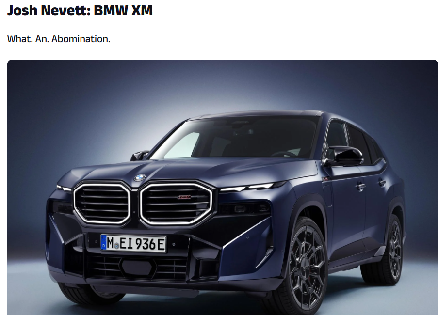 传统豪华品牌在此次评选中同样未能幸免。奔驰CLA因设计平淡而上榜;凯迪拉克Lyriq被批评为“棱角分明、繁复且锯齿状的细节过头了”。宝马XM则被描述为“畸形者”,评审意见指出其庞大的身躯、超大的肾形格栅、笨拙的折痕和微弱的灯光特征使得设计缺乏连贯性,失去了宝马传统的优雅感。同时上榜的还有Mahindra XUV700和斯巴鲁Outback Wilderness,它们同样因外观设计问题被列入榜单。